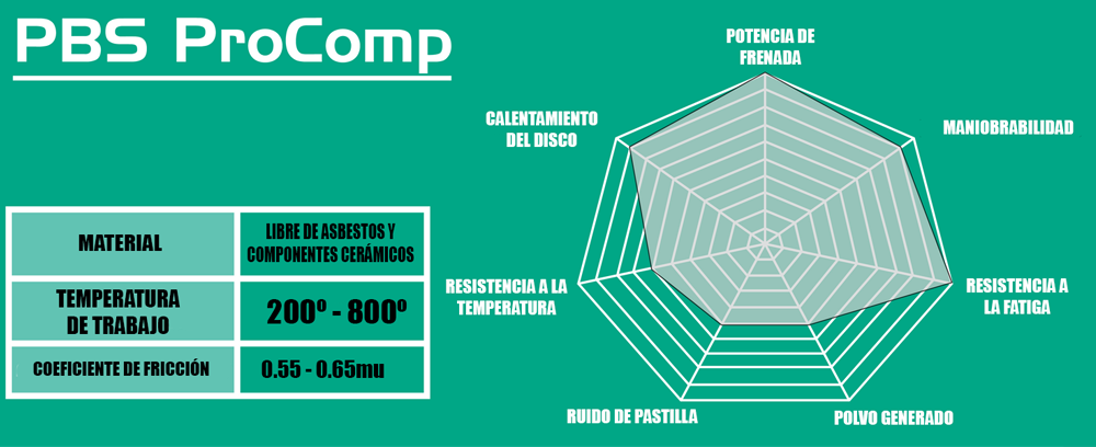 El compuesto ProComp es un material semimetálico que tiene mayor mordida inicial que el compuesto ProRace. Con una excelente potencia de frenada de 0,55 a 0,65 mu, este compuesto se utiliza en la serie Time Attack y es adecuado para coches con pedalier de competición. La compresión de la pastilla es muy baja, por lo que el recorrido del pedal es corto y se mantiene constante.